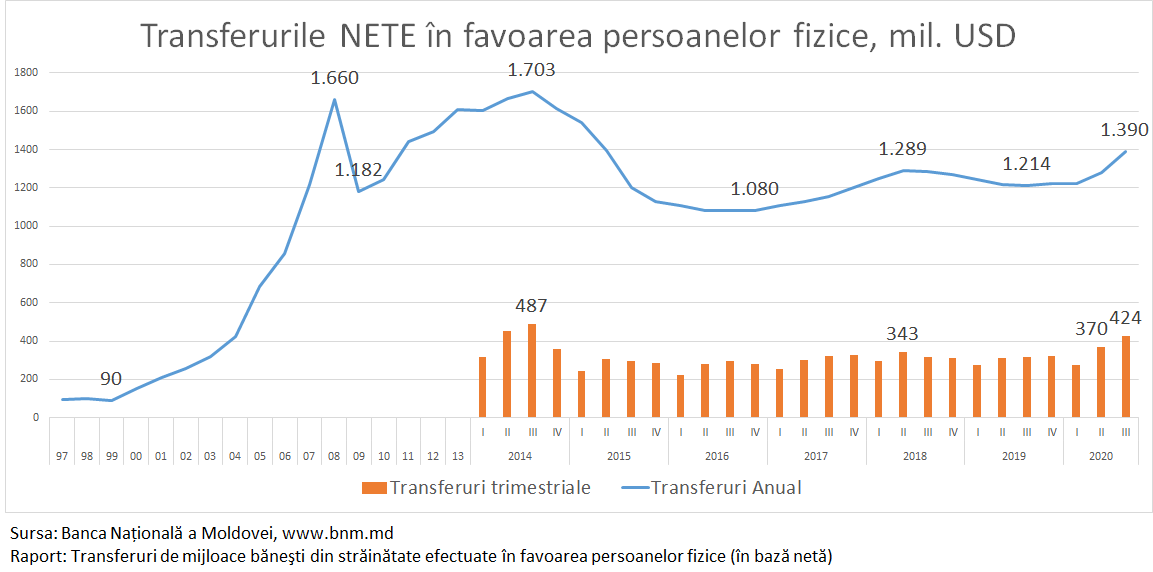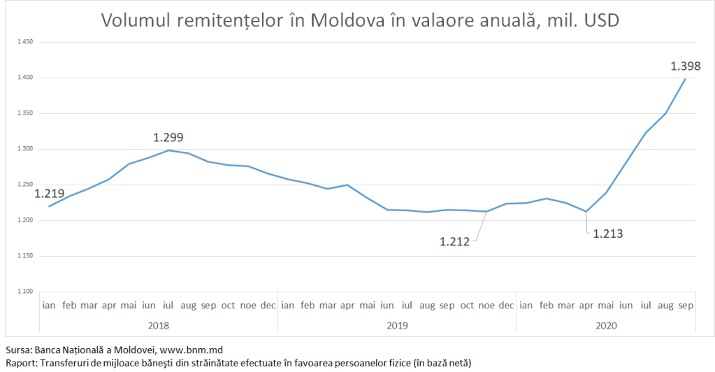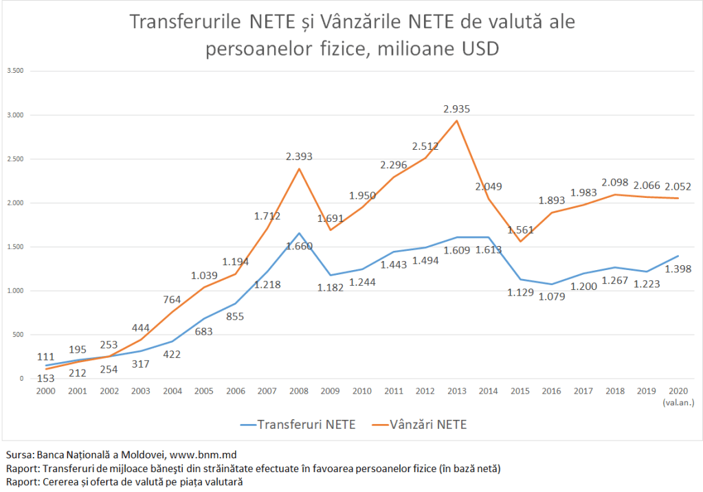 Dacă analizăm volumul transferurilor oficiale și volumul real de valută vândut de către moldoveni observăm că în ultimii 3 ani de zile, inclusiv în 2020 vânzările de valută sunt stabile la nivel de 2.1 miliarde USD. În acest an au crescut doar transferurile oficiale nu și volumul de valută vândută de moldoveni. Deci putem spune că această creștere puternică a remitențelor are loc exclusiv din contul reducerii transferurilor neoficiale.