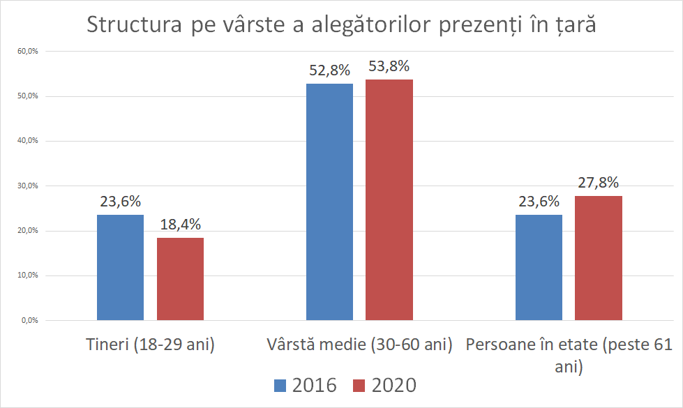 Structura alegătorilor. În ultimii 4 ani în Moldova a avut loc cea mai profundă schimbare a structurii alegătorilor din toate timpurile. Astfel ponderea tinerilor a scăzut de la 23,6% la 18,4%, iar ponderea persoanelor în vârstă a crescut de la 23,6% la 27,8%. Persoanele în vârstă au o prezență la vot de două ori mai mare decât a tinerilor. Astfel rata de participare a persoanelor în vârstă este de peste 85%, iar a celor tineri e mai puțin de 45%. Datorită creșterii ratei celor în vârstă, prezența la vot va crește cu 2-3%, cea ce va compensa parțial efectele negative ale pandemiei.