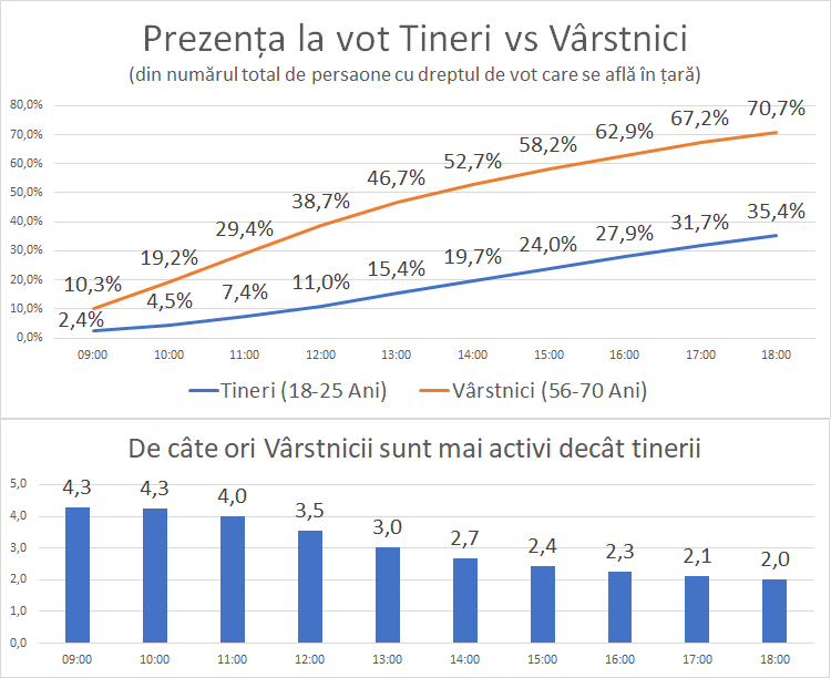 În primele ore ale dimineții prezența tinerilor la vot comparativ cu a vârstnicilor era de 4,3 ori mai mică, dar după orele 12:00 această diferența a început să scadă semnificativ.