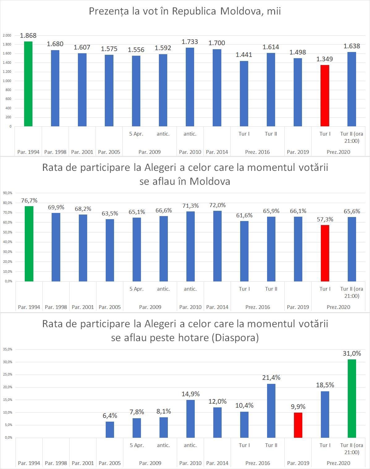 Cei aflați in Moldova la orele 21:00 au o rată de participa de 65,6% puțin sub nivelul din turul II din 2016.