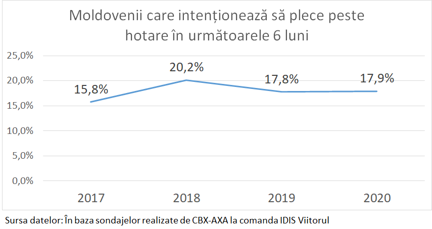 Aproape 18% dintre moldoveni declară că intenționează să plece la muncă peste hotare în următoarele 6 luni. Intenția de plecare este similară cu cea de anul trecut, când din țară au plecat peste 36 de mii de cetățeni. Acest fapt, permite de presus că migrația moldovenilor în acest an va fi în jur de 35 – 40 de mii de persoane. Pentru al 4-le-a an consecutiv, Institutul pentru Dezvoltare și Inițiative Sociale (IDIS) „Viitorul”, împreună cu CBX-AXA, a realizat o cercetare socio-economică privind migrația din Republica Moldova.