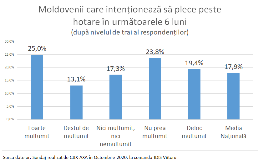Expertul în politici economice ai IDIS „Viitorul”, Veaceslav Ioniță, care a realizat cercetarea, susține că dintre persoanele intervievate, cea mai mare intenție de plecare o au persoanele cu venituri mari, care afirmă că starea lor materială este una foarte bună. Fiecare al 4-lea moldovean, cu o stare materială bună, intenționează să plece în următoarele luni peste hotare.