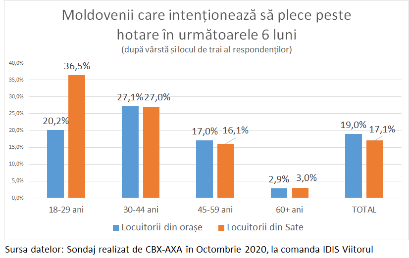 Din toate categoriile de vârstă, tinerii din zonele rurale au cea mai mare intenție de a migra. Astfel 36,5% dintre ei spun că intenționează să părăsească Republica Moldova în următoarele 6 luni. Acest fenomen este relativ ușor explicabil, în sate tinerii nu au nici o șansă de ași organiza viața și ei migrează fie spre orașe, fie în cele mai dese cazuri înafara țării.