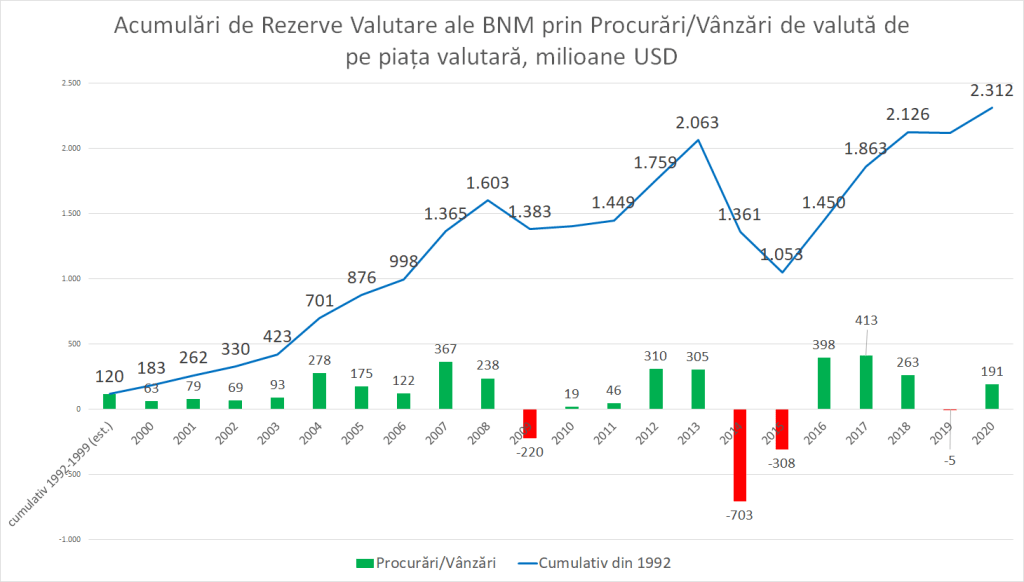 Pentru a înțelege aceasta, economistul explică cum sunt formate rezervele valutare ale BNM și care este rolul lor. În prezent, rezervele valutare ale BNM au atins cota de 3,7 miliarde de dolari, dintre care 1/3 sunt formate din împrumuturi, depozite ale băncilor comerciale, iar 2,3 miliarde de dolari sau 63% sunt banii noștri, ai mei și ai tăi, pe care BNM i-a acumulat pe parcursul a 29 de ani, începând cu anul 1992 când a fost creată BNM.