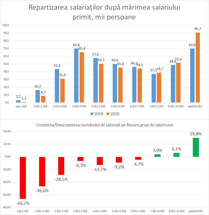 Acest fapt devine și mai evident, dacă urmărim evoluția numărului de salariați pe fiecare categorie de salarizare. Astfel numărul salariaților pe fiecare grup de salarizare până în 7 mii lei/lunar în 2020 s-a redus comparativ cu 2019. Cea mai mare reducere de peste 3 ori este în cel mai mic grup de salarizare de până în 2 mii lei/lunar. Iar în ultimele 3 grupe de salarizare numărul salariaților din contra a înregistrat creștere, iar cea mai mare creștere este în grupul cu peste 10 mii lei/lunar.