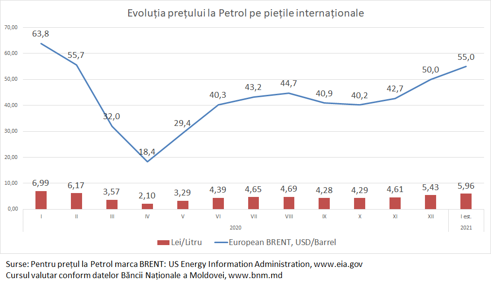 2. Crește prețul petrolului pe piețele Internaționale. Astfel in Septembrie-Octombrie 2020 prețului unui barrel se petrol a fost de 40 USD. In Decembrie el s-a scumpit cu 25% pana la 50 USD. Iar in prezent a mai crescut cu 10% pana la 55 USD/barrel. Recalculat în lei un litru de petrol doar în acest an s-a scumpit cu 56 bani/litru