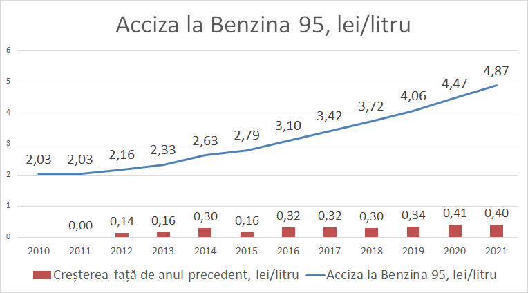 1. A crescut acciza la produse petroliere. La benzina acciza a crescut de la 4,47 lei/litru la 4,87 lei/litru. Împreuna cu TVA impozitele in acest an sau majorat cu 48 bani/litru.
