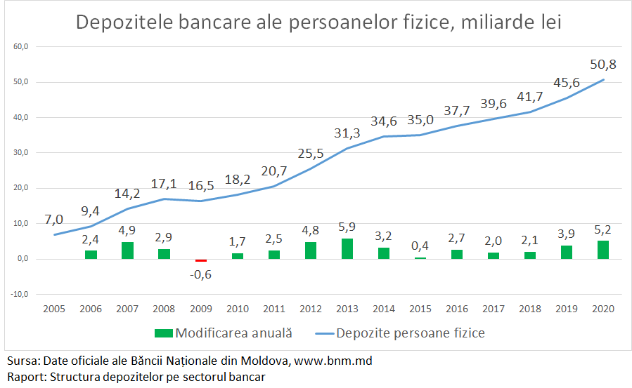 În anul 2020 depozitele bancare ale persoanelor fizice din băncile comerciale din Moldova au crescut cu 5,2 miliarde lei și au atins maxima istorică de 50,8 miliarde lei. Anul 2020 a înregistrat a doua cea mai mare creștere a depozitelor bancare ale persoanelor fizice, maxima fiind stabilită în 2013, când depozitele bancare ale persoanelor fizice au crescut cu 5,9 miliarde lei.