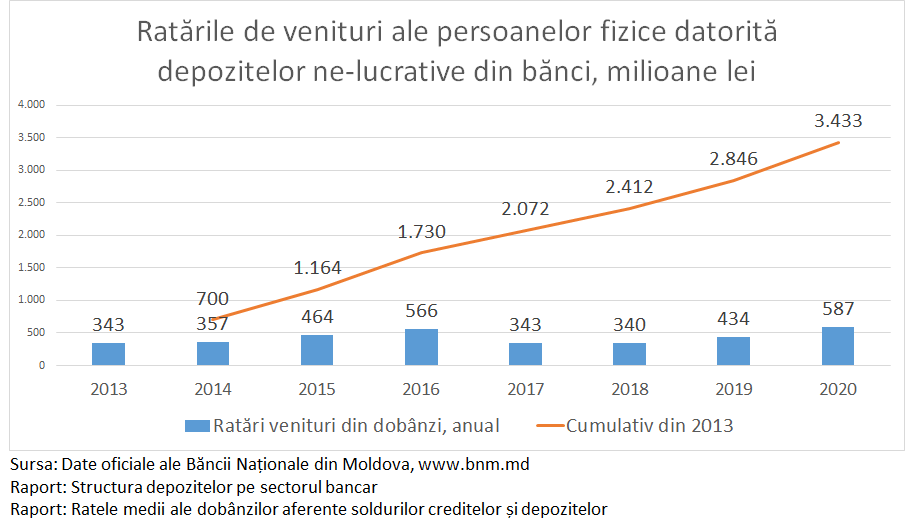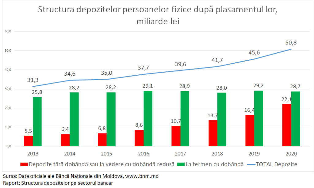 Însă avem și o mare problemă, legată de modul cum persoanele fizice î-și gestionează economiile lor din bănci. Astfel în 2020 depozitele bancare au crescut exclusiv din contul depozitelor fără dobândă sau cele la vedere cu dobânda redusă. Depozitele la termen, care aduc venituri proprietarilor lor, din contra au înregistrat o scădere de 500 milioane lei. Astfel din total depozitelor bancare ale persoanelor fizice 10,5 miliarde lei stau în bănci fără dobândă, iar alte 11,6 miliarde lei sunt la vedere cu o dobândă de 5 ori mai mică decât dobânda bancară obișnuită.