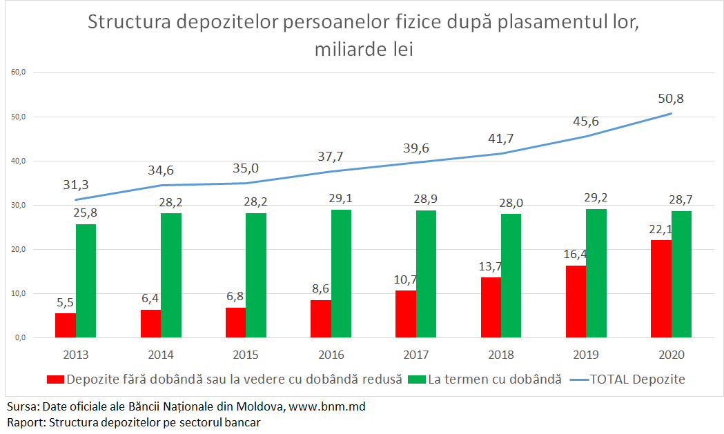 Însă avem și o mare problemă, legată de modul cum persoanele fizice î-și gestionează economiile lor din bănci. Astfel în 2020 depozitele bancare au crescut exclusiv din contul depozitelor fără dobândă sau cele la vedere cu dobânda redusă. Depozitele la termen, care aduc venituri proprietarilor lor, din contra au înregistrat o scădere de 500 milioane lei. Astfel din total depozitelor bancare ale persoanelor fizice 10,5 miliarde lei stau în bănci fără dobândă, iar alte 11,6 miliarde lei sunt la vedere cu o dobândă de 5 ori mai mică decât dobânda bancară obișnuită.