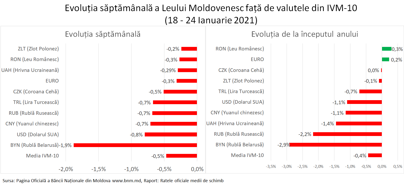 Săptămâna trecută, 18-24 ianuarie 2021, Leul Moldovenesc a înregistrat o depreciere ușoară (-0,5%) față de toate cele 10 valute din IVM-10. Cel mai mult s-a depreciat față de USD și valutele din regiune ale țărilor non-UE, care după o cădere puternică din 2020 încep acum să-și revină ușor.