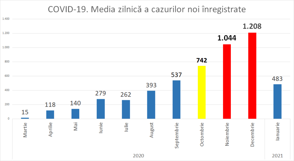În luna ianuarie în Moldova au fost înregistrate în mediu 483 cazuri noi pe zi de infectări cu COVID-19. Am înregistrat o scădere bruscă de 2,5 ori față de luna decembrie 2020, când a fost stabilit recordul absolut de 1.208 cazuri noi pe zi. Ultima dată mai puțin cazuri înregistrate am avut în septembrie 2020, când au fost zilnic depistate câte 393 cazuri noi de COVID-19.