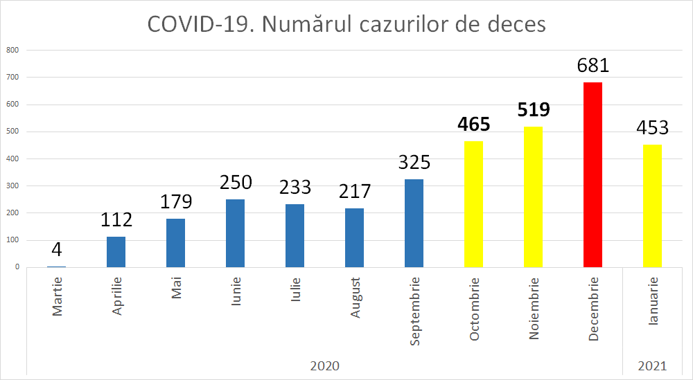 Este îmbucurător faptul că și numărul cazurilor de deces din urma COVID-19 au înregistrat o scădere semnificativă de la 681 decese în decembrie 2020 la 453 decese în ianuarie 2021. Cei drept ritmul de scădere a cazurilor de decese este mult mai mic decât a numărului de cazuri de noi infectați. Sperăm totuși că numărul mic de cazuri noi înregistrate va influința pozitiv tendința de scădere a deceselor pentru luna februarie.