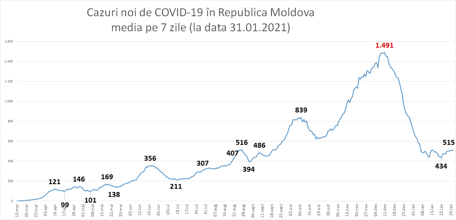 Astfel pe 20 ianuarie media săptămânala a cazurilor noi înregistrate a scăzut până la 434 cazuri noi pe zi, iar peste 10 zile la 31 ianuarie media săptămânală s-a înrăutățit cu 20% ajungând la 515 cazuri noi pe zi. Este prematur să vorbim de o nouă creștere a numărului de cazuri noi înregistrate, dar semnale că acest lucru se poate întâmpla deja le atestăm.