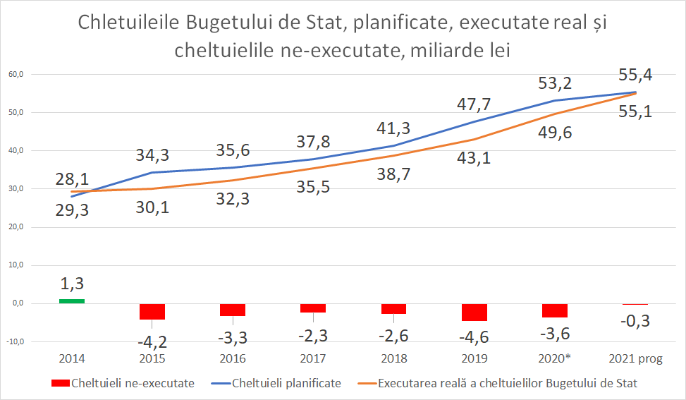 Deja oficial, conform datelor ministerului finanțelor, bugetul de stat în 2020 a fot încheiat cu o gaură de executare de 3,6 miliarde lei. Astfel după ultimele rectificări aprobate de Parlament în septembrie 2020 Guvernul urma să execute bugetul la capitolul cheltuieli în volum de 53,2 miliarde lei. Însă datorită faptului că nu s-a reușit obținerea de granturi și împrumuturi externe ,bugetul a fost executat doar la nivel de 49,6 miliarde lei.