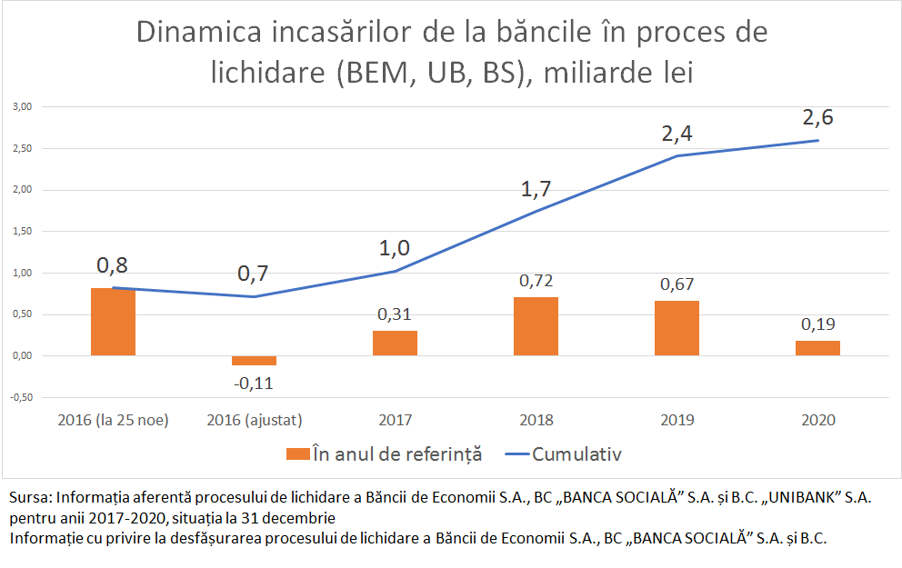 […] „Reamintim că la situația din 25 noiembrie 2016 noi cetățenii Republicii Moldova, mulțumită Guvernului am oferit garanții de 14,1 miliarde lei, celor trei bănci: Banca de Economii, UniBanc și Banca Socială. Împreună cu dobânda aferentă garanțiilor oferite, noi avem de achitat și respectiv de recuperat 25 miliarde lei. Iar până în prezent s-a reușit recuperarea a 2,6 miliarde lei, sau 10% din suma totală”, a explicat expertul pe blogul său. […]
