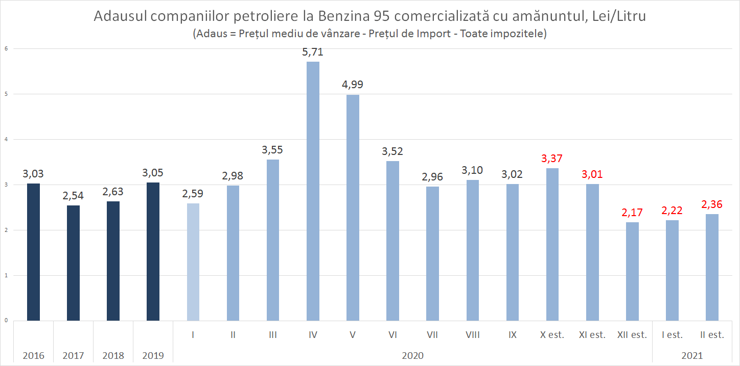 Este foarte ușor de observat că adaosul comercial aplicat de companiile petroliere a scăzut brusc, odată cu scumpirea Petrolului pe piețele internaționale. De fapt companiile petroliere în perioada de creștere a prețurilor preferă să aplice un adaos comercial minim.