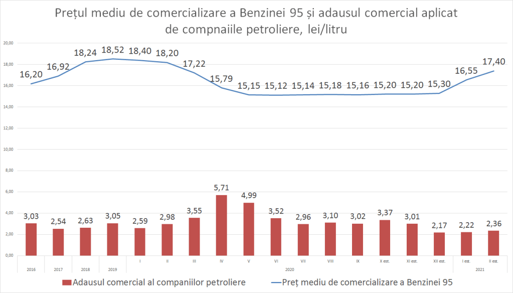Anul 2021 a venit cu scumpiri în serie a prețurilor la produsele petroliere, fapt care deloc nu bucură pe nimeni. Deoarece ANRE publică datele de pe piața produselor petroliere cu o întârziere de până la 5 luni de zile, în analiza noastră suntem nevoiți să operăm cu prețuri estimative. În decembrie prețul mediu de comercializare a Benzinei 95 a fost estimativ la nivel de 15,3 Lei/litru, cea ce înseamnă un preț mediu la pompă de circa 15,7 lei/litru. În luna februarie estimăm că prețul mediu de comercializare va fi cu minim 2,1 lei/litru mai mult și va constitui circa 17,4 lei/litru, cea ce înseamnă un preț mediu la pompă de circa 17,9 Lei/litru. Prețul mediu de comercializare este aproximativ cu 2,5% mai mic decât prețul mediu de la pompă. Aceasta se explică prin faptul că companiile petroliere o parte importantă de produse petroliere le vând prin contracte pe termen lung, unde prețul unui litru de Benzină sau motorină este mult mai mic decât cel de la pompă.