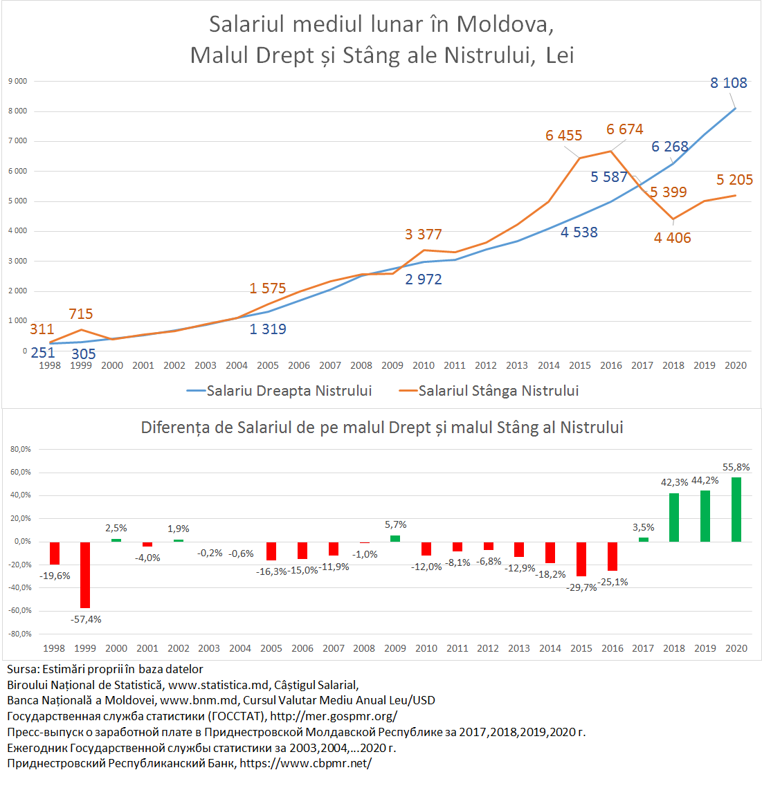 Astfel în 2020 în Moldova pe partea dreaptă a Nistrului salariul a cunoscut cea mai mare creștere din ultimii 15 ani, înregistrând o majorare de 874 lei/lunar sau 12,1% comparativ cu anul 2019. (mai multe detalii vezi aici). În același timp în Stânga Nistrului salariul mediu lunar în valori nominale a crescut cu doar 5,3% de la 4.595 ruble/lunar în 2019 la 4.838 ruble/lunar în 2020.