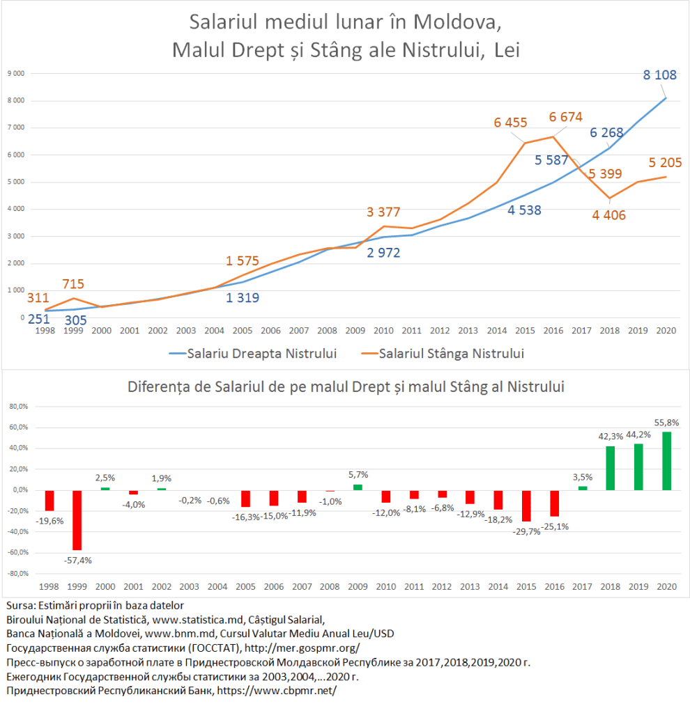 Discrepanța dintre veniturile salariale dintre cele două maluri ale Nistrului s-au aprofundat și mai mult în 2020. Astfel diferența de salarizare a crescut de la 44% în 2019 la aproape 56% în 2020. Acest decalaj a fost determinat de doi factori: 1) ritmul de creștere a salariilor pe ambele maluri ale Nistrului, 2) deprecierea rublei din Stânga Nistrului față de leul moldovenesc.
