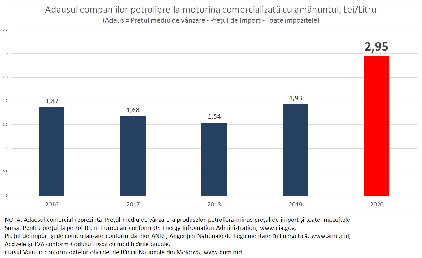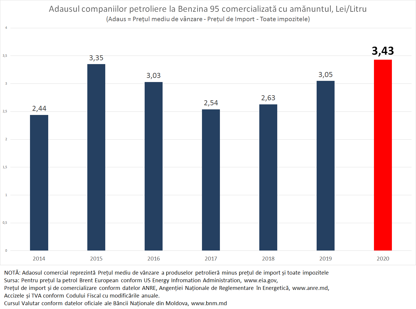 Anul trecut companiile petroliere au aplicat cel mai mare adus comercial le Benzina 95, de 3.43 lei/litru, cea ce este cu 65 bani/litru sau 25% mai mult decât în perioada când prețurile la produsele petroliere erau plafonate (anii 2017-2018). În an de criză, când prețul la Petrol a atins cota minimă din ultimii 25 ani, moldovenii nu au reușit să se bucure pe deplin de prețuri mici la Benzină și Motorină.