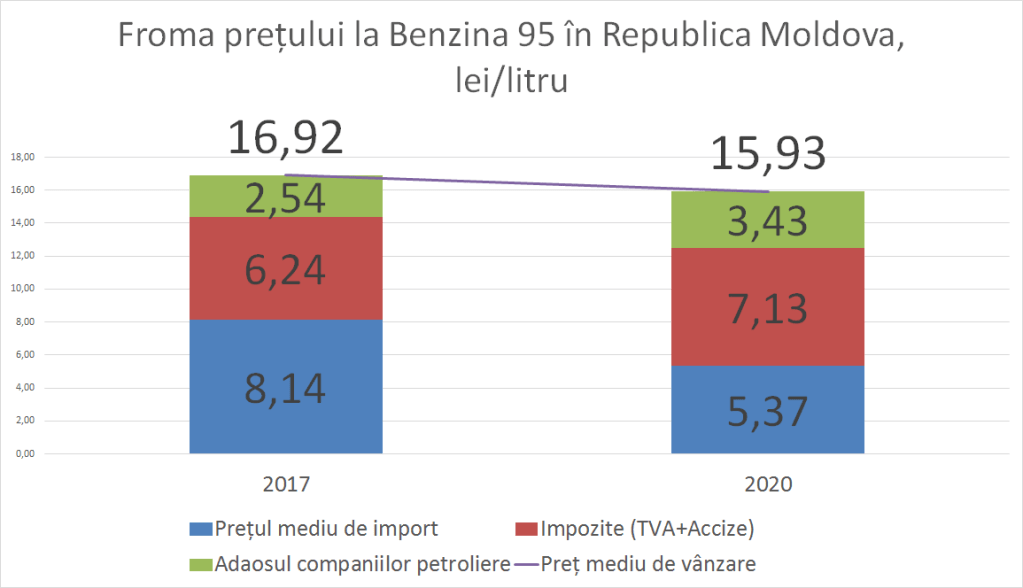 Astfel în 2020 TVA și Acciza la Benzină a constituit 7,13 lei/litru, cu 88 bani/litru mai mult decât în 2017. Iar adausul comercial aplicat de companiile petroliere în 2020 a fost cu 89 bani/litru mai mult decât în 2017 și a constituit 3,43 lei/litru, față de 2,54 lei/litru în 2017.