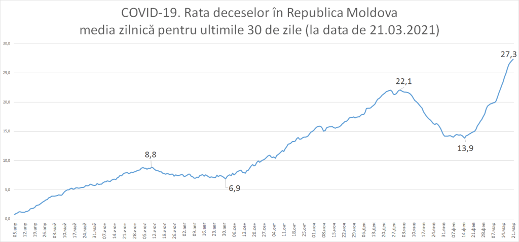 Tendința din nefericire este una destul de alarmantă. Media lunară a cazurilor de deces provocate de COVID-19 înregistrează o tendință de creștere și este de două ori mai mare decât acum o lună.