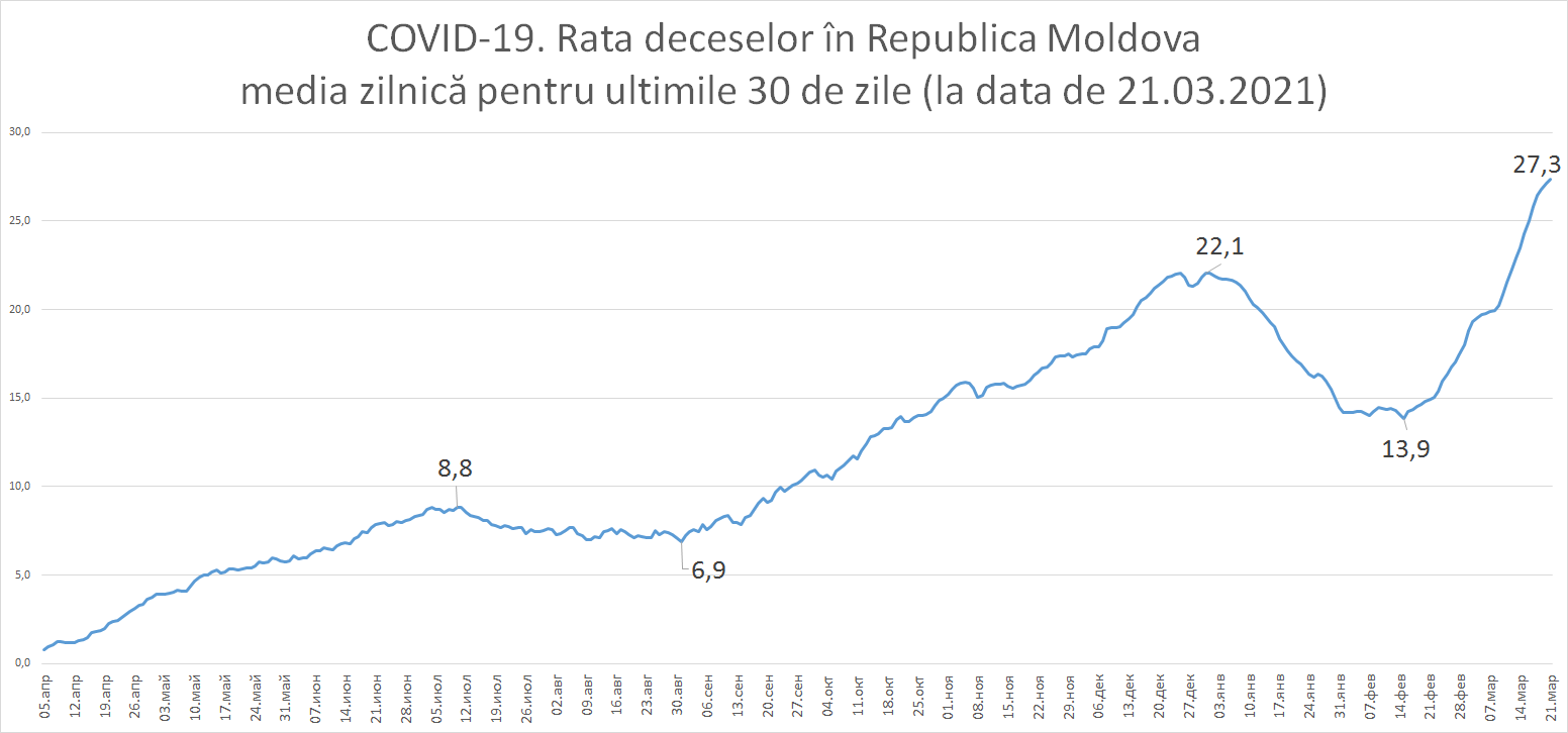 Primul caz de deces a avut loc în a treia săptămână din martie 2020 și anume pe data de 18. La un an distanță în săptămâna 15-21 martie 2021, Moldova a înregistrat 229 decese provocate de COVID-19, valoarea maximă de la începutul pandemiei.
