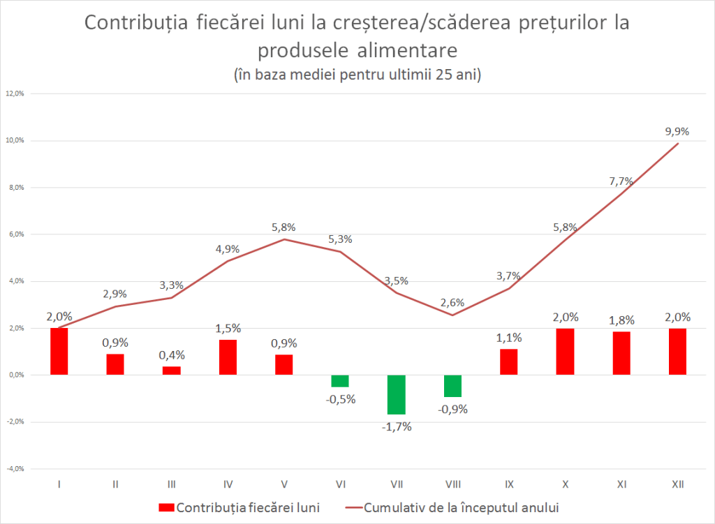 În ultimii 25 de ani prețurile la produsele alimentare în Moldova au crescut anual în mediu cu 9,9%. Cea mai mare contribuție la creșterea prețurilor la produsele alimentare le au lunile de iarnă-primăvară, iar vara de regulă prețurile înregistrau o scădere în mediu cu 3,1%.