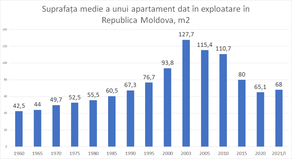 În ultimii ani se înregistrează o tendință clară de micșorare a suprafeței medii a unui apartament nou dat în exploatare. În anul 2020 suprafața medie a unui apartament nou a fost de 65 m2, cea ce este de 2 ori mai puțin decât în anul 2003, când a fost atinsă maxima istorică de 128 m2 pentru un apartament nou.