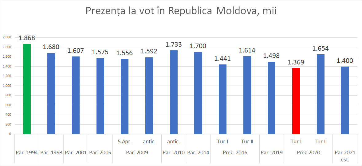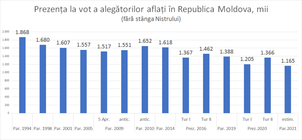 Estimăm că alegătorii aflați în Republica Moldova, fără stânga Nistrului vor ieși la vot în număr de 1.165 mii persoane, cea ce reprezintă minimul istoric absolut de la toate scrutinele din Moldova.