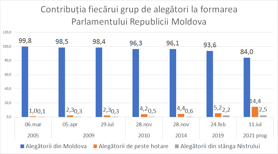 Datorită prezentei slabe a celor din ţară şi o prezenţă bună a celor de peste hotare, Diaspora va decide soarta la 14 mandate de Deputaţi, Populaţia din Stânga Nistrului la 3 mandate de deputaţi, iar cei din interiorul ţării la 84 mandate.