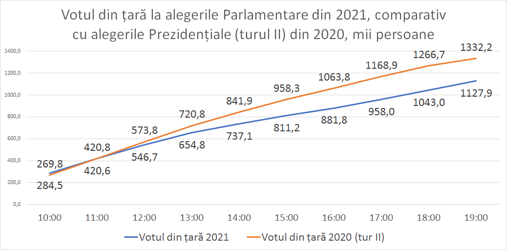 Numeric vorbind la ora 19:00 în ţară prezenţa la vot a fost de 1,12 milioane alegători, sau cu 204 mii mai puţini decât în 2020 la aceaşi oră.