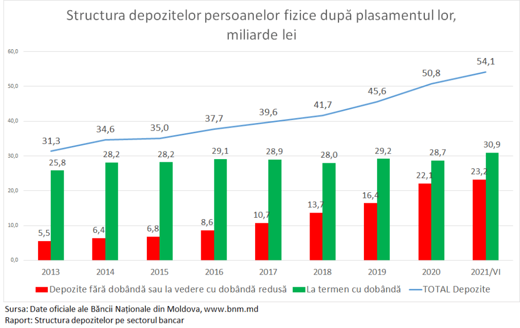 În prima jumătatea a anului 2021, depozitele deținute de persoanele fizice în bănci au crescut cu 3,3 miliarde lei și au ajun la 54,1 miliarde lei. În mediu economiile moldovenilor au crescut lunar cu 552 milioane lei, cea ce reprezintă un record absolut pentru Moldova și este cu 13% mai mult decât precedentul record stabilit în 2013, când depozitele au crescut lunar cu 489 milioane lei.