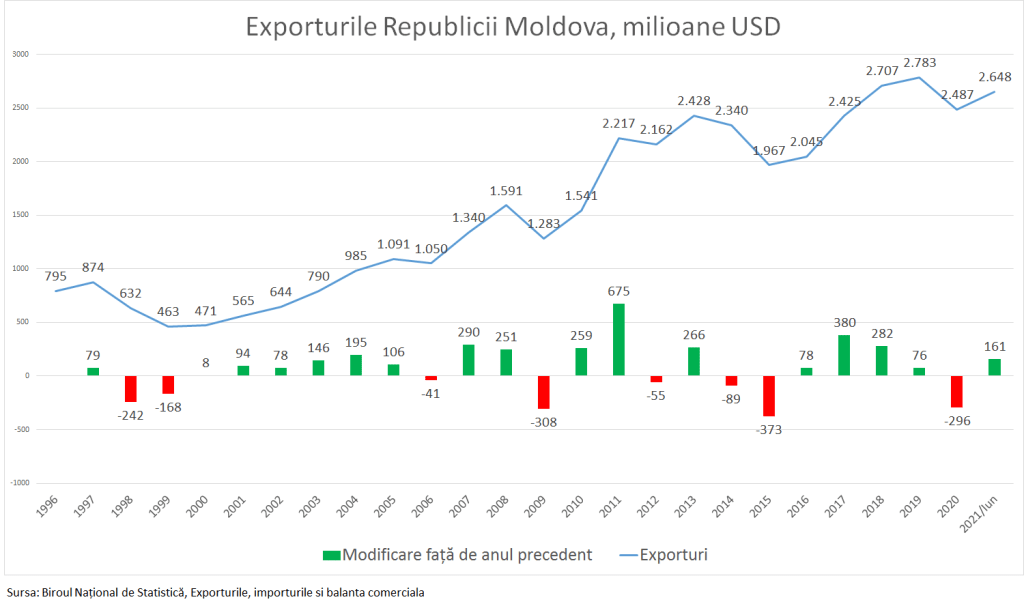 După criza din 2020, când exporturile moldovenești au cunoscut o scădere de 10,6% sau -296 milioane USD, în acest an ele au înregistrat o recuperare destul de promoțătoare.