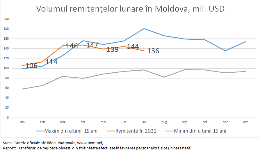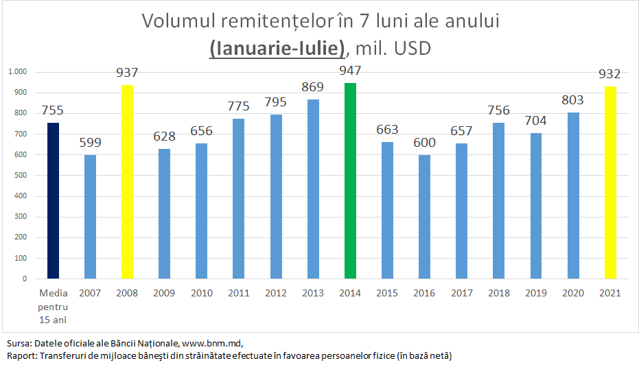 Volumul remitențelor în primele 7 luni ale anului au constituit 932 milioane USD, valoare maximă din ultimii 7 ani. Pentru această perioadă, maxima a fost atinsă în 2014, când volumul remitențelor au atins cota de 947 milioane USD.