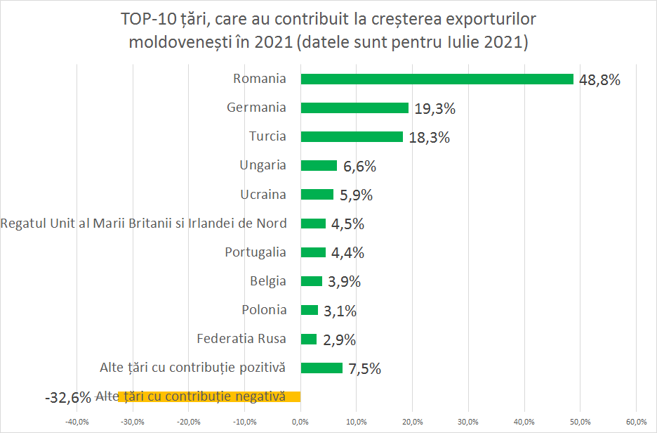 Aproape jumătate din creșterea din acest an de recuperare revine României (+48,8%) urmată de Germania cu (+19,3%). Vecina noastră Ucraina se află pe locul 5 cu o contribuție pozitivă de 5,9%. De fapt în mare parte datorită țărilor din Uniunea Europeană, Moldova a reușit în acest an să-și recupereze exporturile. Contribuția țărilor din afara UE este destul de modestă.