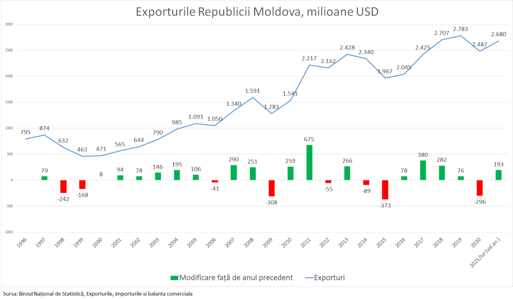 În luna iulie 2021 exporturile moldovenești în continuare au înregistrat o tendință clară de recuperare. Astfel după o reducere de 296 milioane USD în 2020, în prezent exporturile au recuperat peste 65% din căderea de anul trecut și-n valori anuale au ajuns la 2,68 miliarde USD.