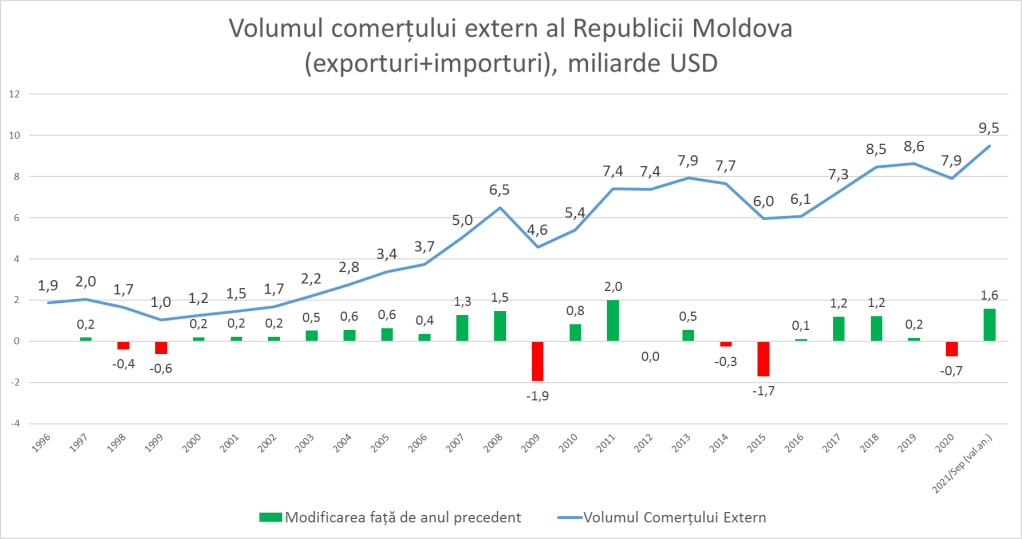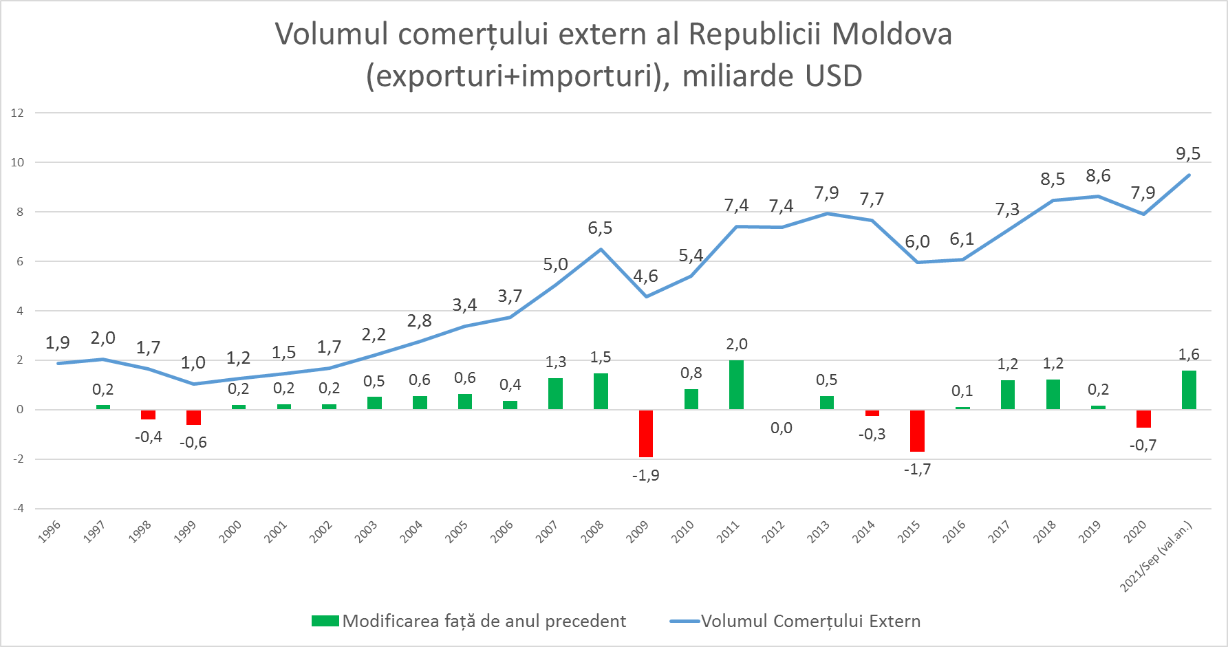 Volumul comerțului extern, care însumează exporturile și importurile Moldovei, a ajuns la 9,5 miliarde USD în valoare anuală, cea ce este cu 1,6 miliarde USD mai mult decât anul trecut și cu un miliarde USD mai mult decât recordul precedent din 2019, când comerțul extern a Moldovei a atins maxima istorică de 8,6 miliarde USD. Până la finele acestui an anticipăm creșterea comerțului extern de până la 10 miliarde USD, un record absolut pentru Moldova.