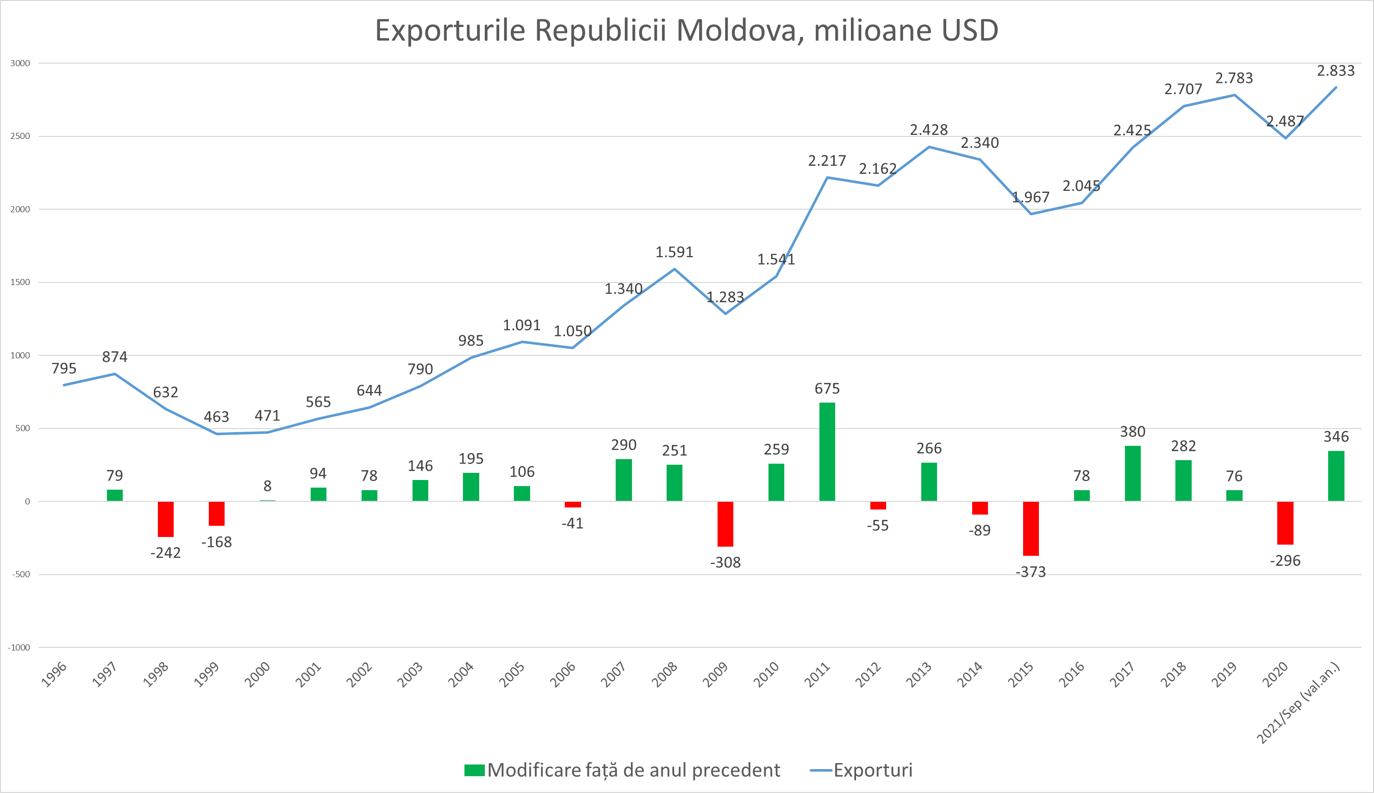 Exporturile moldovenești au trecut de 2,8 miliarde USD în valoare anuală ,cea ce este cu 346 milioane USD mai mult decât anul trecut și mai mult decât recordul istoric din 2019, când exporturile au constituit aproape 2,8 miliarde USD. Cel mai probabil în acest an, pentru prima dată exporturile Moldovei vor depăși cifra de 3 miliarde USD.