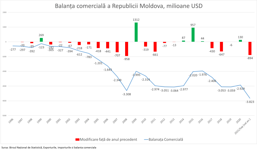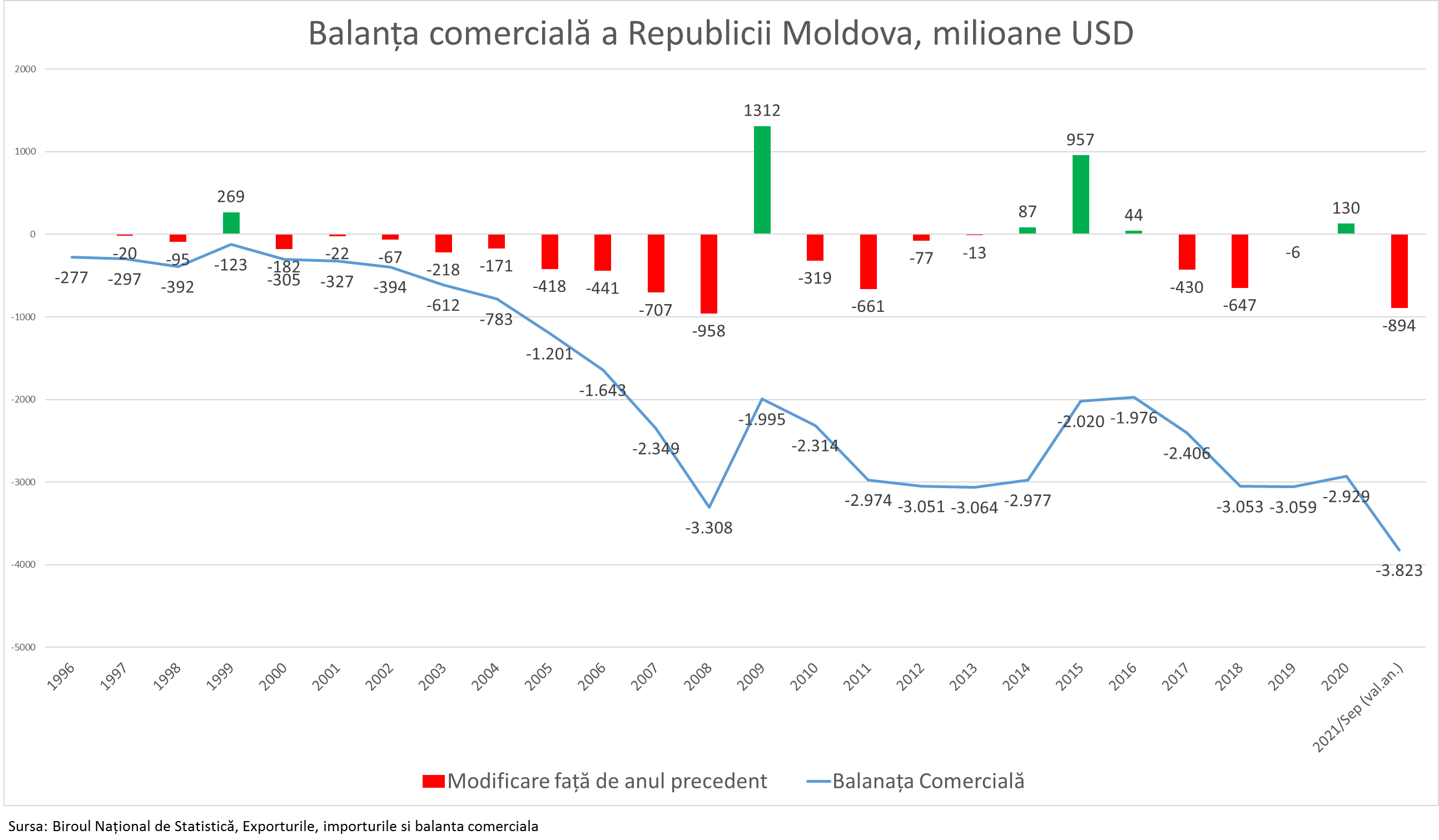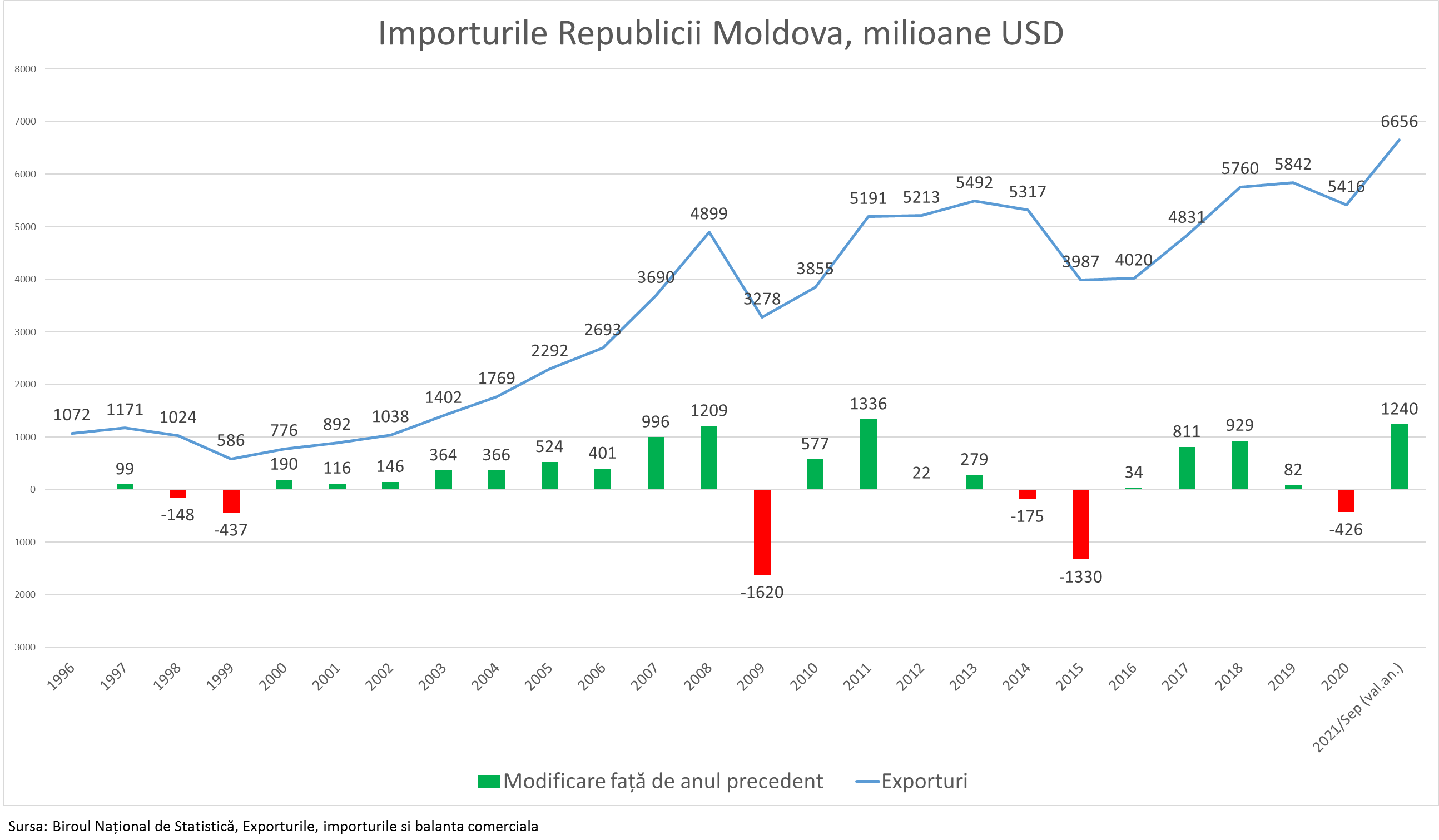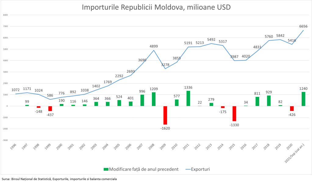 Importurile moldovenești se apropie de 6,7 miliarde USD, cea ce este cu 1,2 miliarde USD mai mult decât anul trecut și cu 800 milioane USD mai mult decât recordul stabilit în 2019. Sunt toate premisele ca în acest an importurile moldovenești să treacă de 7 miliarde USD. Parțial această creștere este determinată de creșterea prețurilor la resursele energetice, produsele alimentare dar și alte bunuri. Însă cel mai mult importurile cresc datorită creșterii puternice a consumului populației, care din păcate este acoperit din importuri, dar nu din producția locală. Mai multe detalii vezi aici.