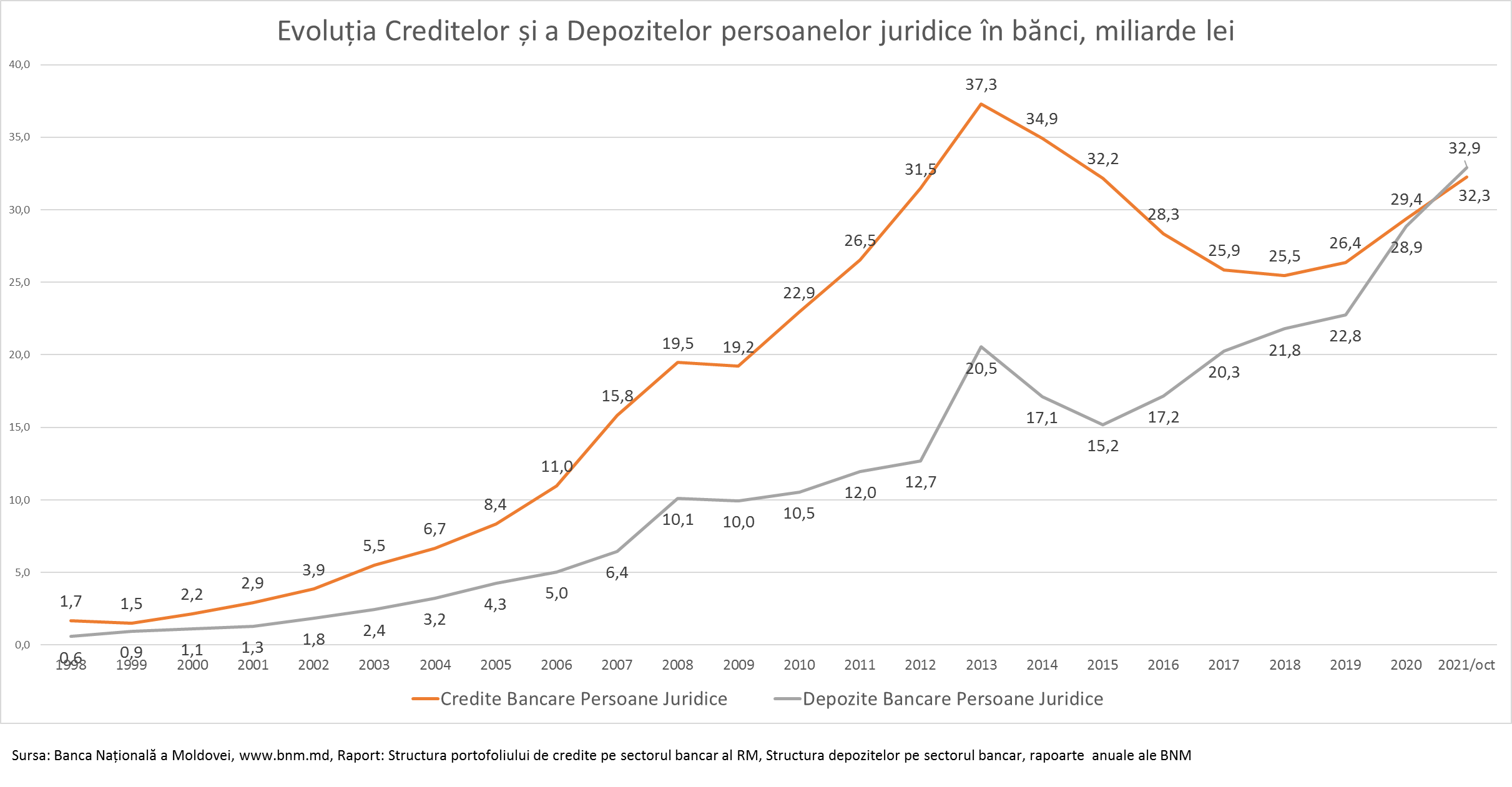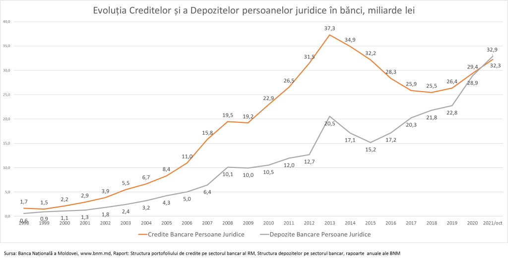 Astfel în ultimele 3 luni volumul depozitelor în sistemul bancar au crescut cu 2,5 miliarde lei de la 84,8 miliarde în iulie 2021 la 87,3 miliarde lei în octombrie. Însă această creștere este exclusiv din contul agenților economici, care în această perioadă și-au majorat depozitele în bănci cu aproape 2,7 miliarde lei. În același timp depozitele populației s-au redus cu aproape 130 milioane lei. Agenții economici în loc să investească banii în dezvoltarea afacerilor și să atragă credite pentru aceasta, ei din contra decid să-și înghețe banii în băncii.