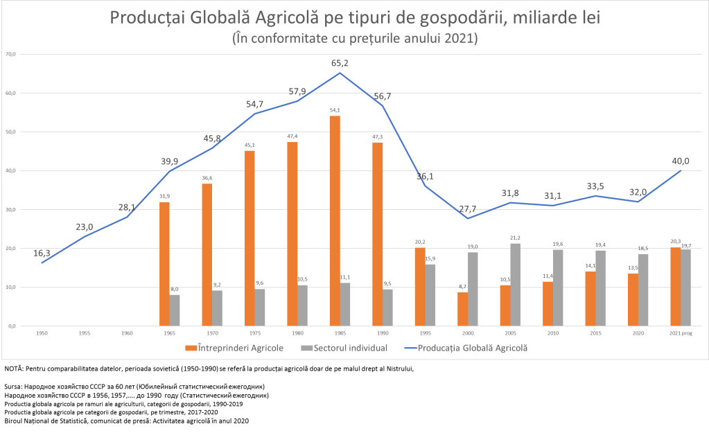 Pentru o înțelegere mai bună a fenomenelor, am elaborat un model, care ne permite să comparăm datele în timp. Astfel am estimat volumul producției agricole globale în Moldova pentru ultimii 70 de ani la valoare și prețurile de astăzi. Pentru ușurarea comparabilității până în 1991 este estimată producția agricolă globală doar pe malul drept al Nistrului.