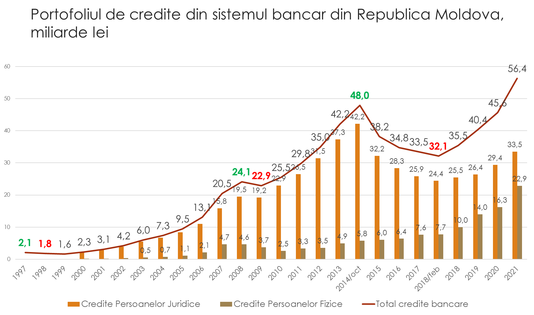 Despre cine sunt debitorii băncilor, economistul a declarat că agenții economici domină în prezent. Volumul total al creditelor bancare acordate acestora este de 33,5 miliarde de lei, dintre care 4,1 miliarde de lei au fost acordate în 2021. Persoanele fizice s-au creditat de la bănci în sumă de 22,9 miliarde de lei, dintre care cu 6,6 miliarde de lei în 2021.