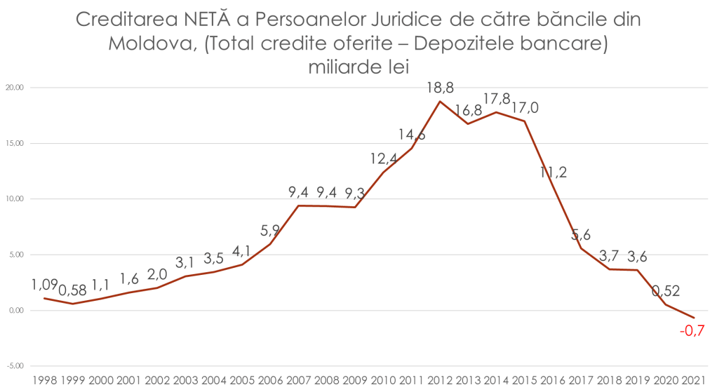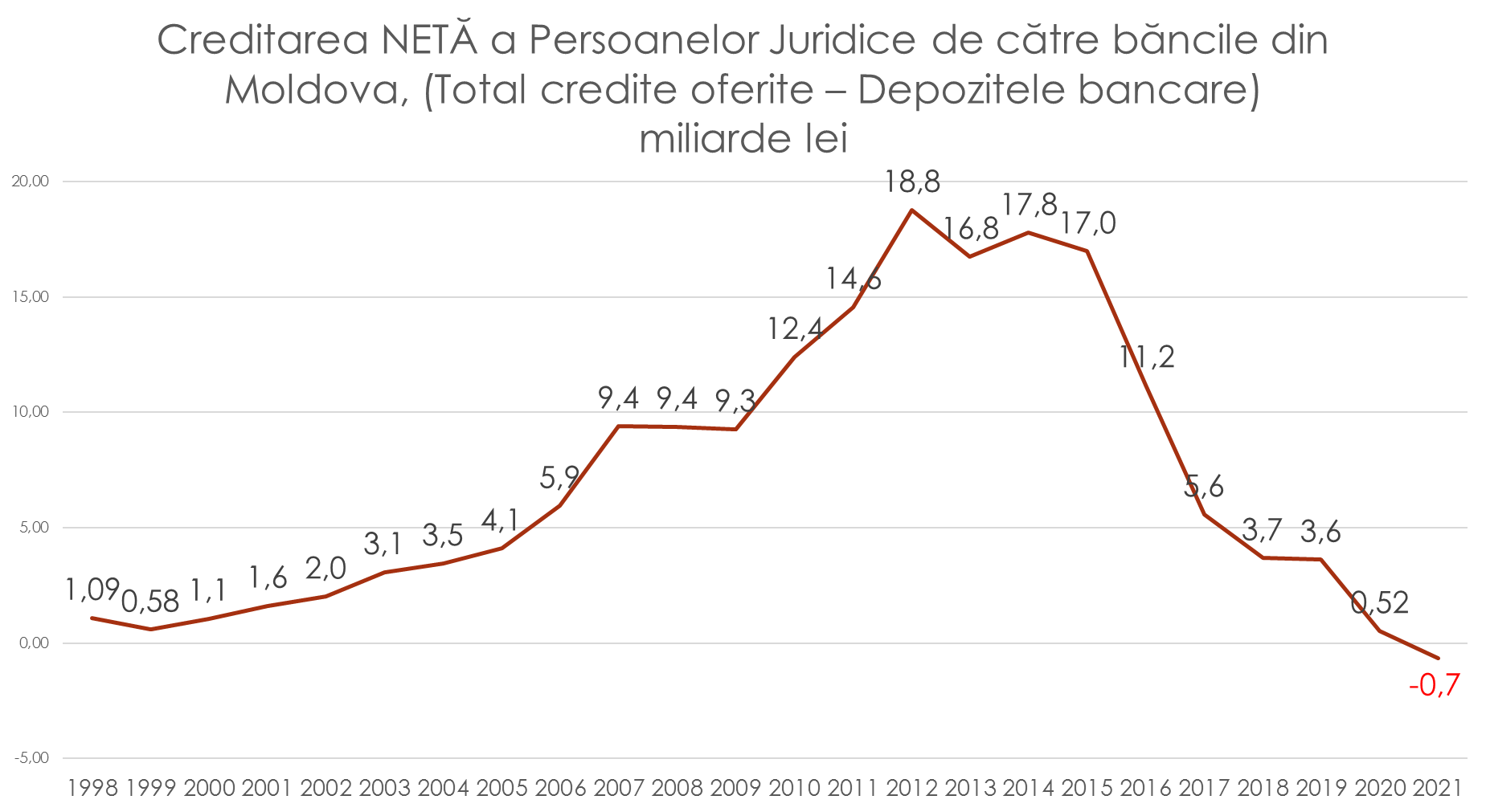 În 2021, potrivit economistului, pentru prima dată în istoria țării a fost negativă creditarea netă a persoanelor juridice, în minus cu 700 de milioane de lei. Volumul depozitelor bancare care aparțin persoanelor juridice a fost mai mare decât volumul creditelor luate. Aceștia au avut anul trecut în bănci 34,2 miliarde de lei sub formă de depozite, iar volumul creditelor acordate a fost de 33,5 miliarde de lei.
