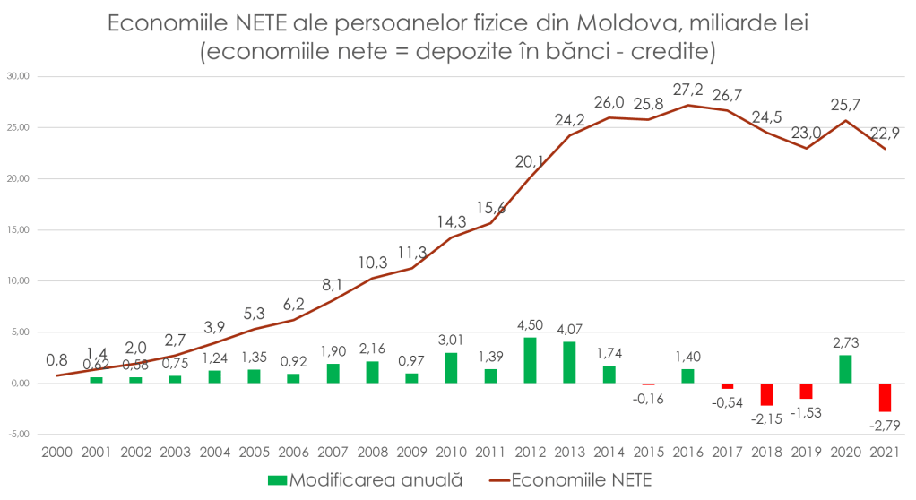 Referitor la economiile nete ale populației, Veaceslav Ioniță a remarcat că în toată istoria țării au fost cinci ani când acestea au fost negative, însă în 2021 a fost înregistrat cel mai negativ nivel. Până în 2017, cetățenii depozitau credite în bănci cu mult mai mult decât lua credite și înclinația spre economii era una pozitivă. Astfel, economiile nete au ajuns la 27 de miliarde de lei în 2016. Acest surplus de bani, a spus expertul, mergea către creditarea agenților economici. Însă, în 2021, a fost înregistrată o creditare netă a populației de -2,8 miliarde de lei. „Oamenii s-au băgat în cheltuieli cu mult mai mult decât au făcut economii”, a conchis Veaceslav Ioniță.