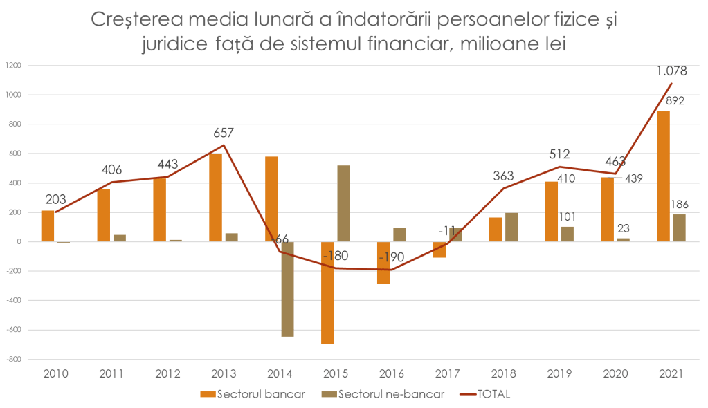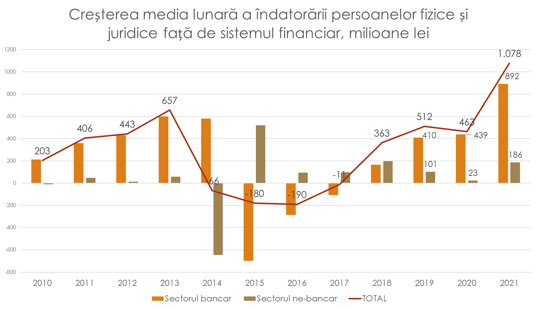 Potrivit expertului, volumul total al creditelor acordate economiei Republicii Moldova a ajuns la aproape 70 de miliarde de lei: 56,4 miliarde de lei este volumul creditelor bancare și de 12,8 miliarde de lei – al celor nebancare. Recordul precedent la creditarea economiei de către sectorul financiar a fost atins în 2014, când creditele au ajuns la 51,6 miliarde de lei. „Gradul de împovărare al moldovenilor a crescut lunar, în 2021, cu peste un miliard de lei. Această creștere a poverii datoriilor este cea mai mare din istoria Republicii Moldova. Dublu față de anii precedenți. A fost ceva similar în anul 2013, dar incomparabil cu anul 2021”, a spus expertul.