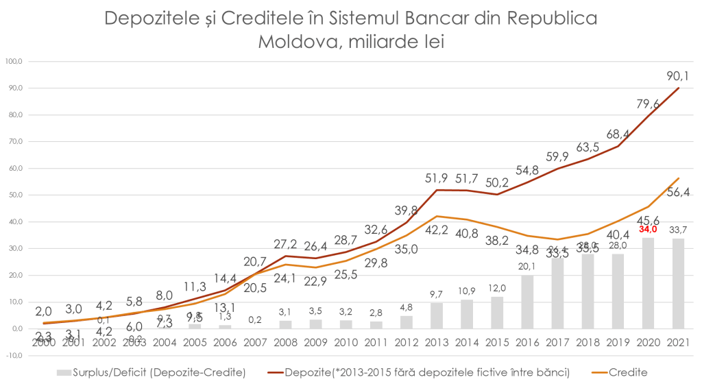 În prezent, afirmă analistul economic, continuă să fie înregistrat un surplus de lichidități în sistemul bancar, fenomen care se atestă al 8-lea an consecutiv. Volumul depozitelor bancare în 2021 a ajuns la 90 de miliarde de lei, cu peste 10 miliarde de lei mai mult comparativ cu 2020 și cu 34 de miliarde de lei mai mult decât volumul celor acordate. Totuși, remarcă analistul economic, după opt ani de creștere continuă a surplusului de lichidități, în 2021 acesta a înregistrat pentru prima dată o reducere nesemnificativă, dar promițătoare.