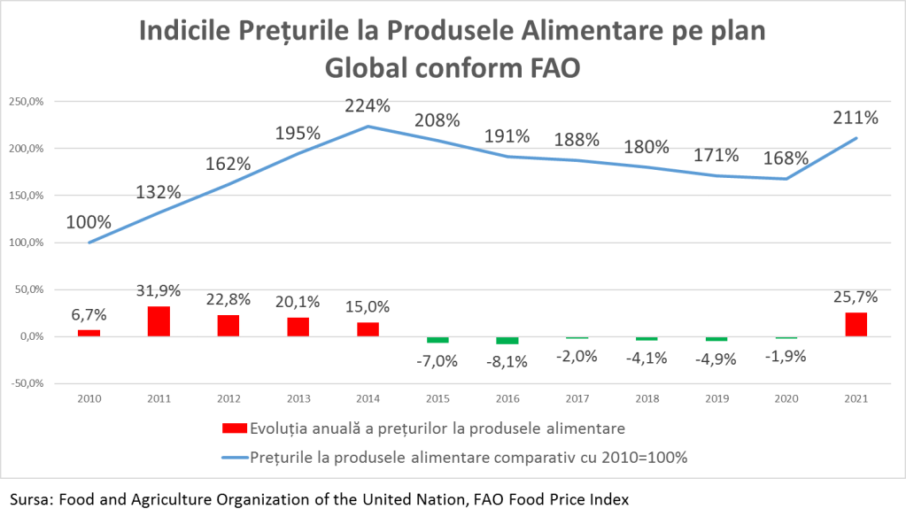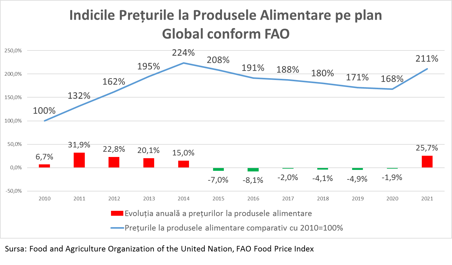 Conform datelor FAO, organizația specializată ONU, prețurile la produsele alimentare la nivel global în 2021 au înregistrat o creștere de 25,7% record pentru ultimii 10 ani. Recordul precedent a fost stabilit în 2011, când prețurile au crescut cu 31,9%. Comparativ cu 2010 în prezent prețurile pe piața globală la produsele alimentare sunt de 2,1 ori mai mari, însă această creștere se datorează perioadei de până la 2014. Creșterea din 2021 pe plan global a prețurilor la produsele alimentare a fost precedată de o scădere pe parcursul a 6 ani a prețurilor, iar în 2021 creșterea doar a recuperat scăderea din precedenții 6 ani.