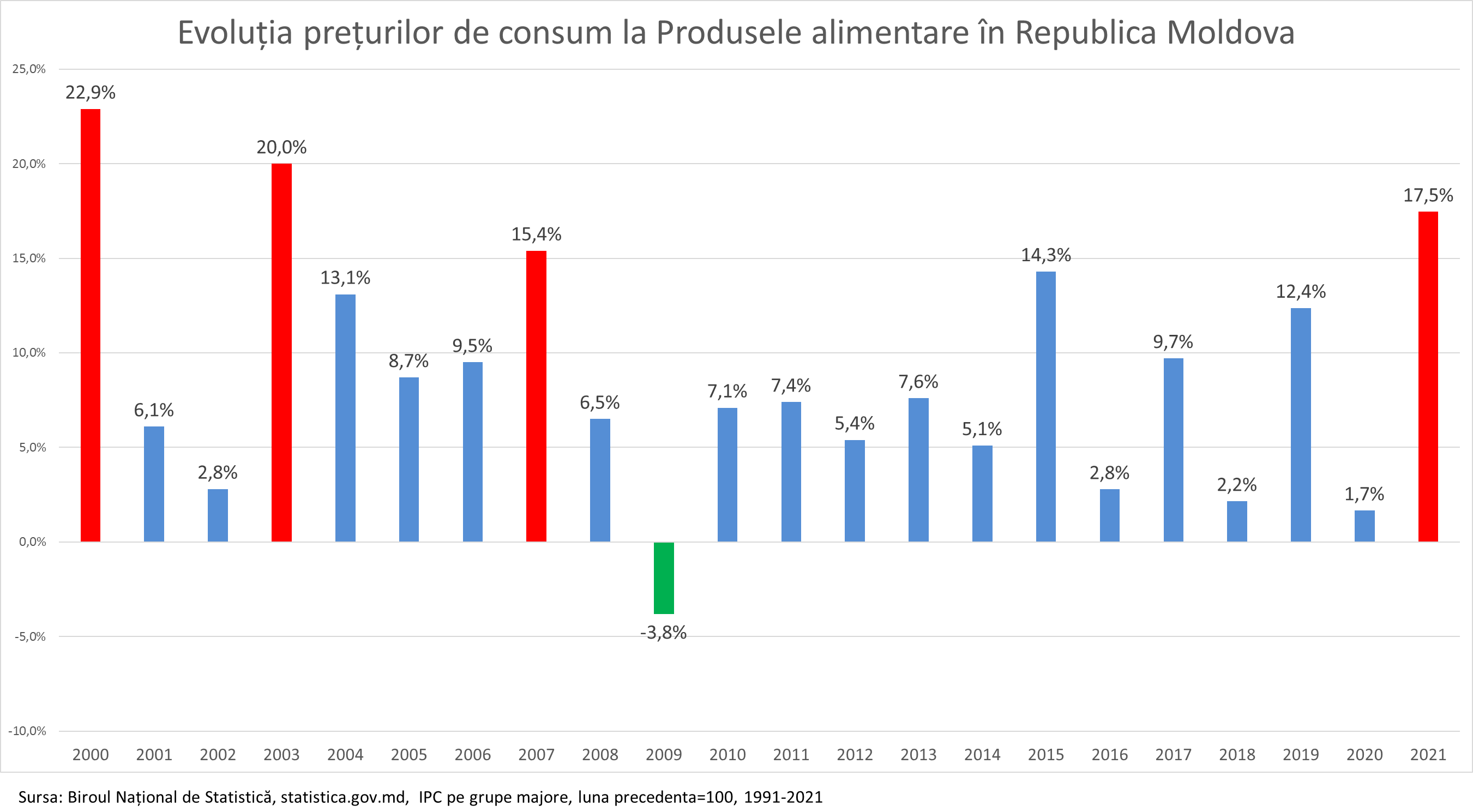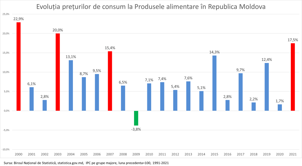 În Moldova prețurile la produsele alimentare în 2021 au crescut cu 17,5%, record absolut pentru ultimii 18 ani. Recordul precedent a fost stabilit în 2003, când prețurile la produsele alimentare au crescut cu 20%. În toată perioada de independență, Moldova a avut un singur an, când prețurile la produsele alimentare au înregistrat o scădere față de anul precedent. S-a întâmplat acest lucru în 2009, când prețurile au înregistrat o scădere de 3,8%.